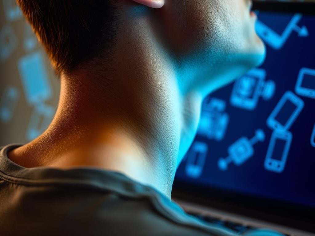 - Chroniczne pochylanie głowy nad ekranem, co prowadzi do nadmiernego napięcia mięśni szyi.